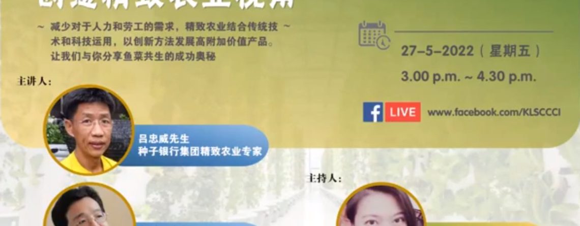 By: 吉隆坡暨雪兰莪中华总商会 KLSCCCI (隆雪中总) “创意精致农业视角”线上讲座减少对于人力和劳工的需求,精致农业结合传统技术和科技运用,以创新方法发展高附加价值产品。今天,让我们与你分享鱼菜共生的成功奥秘,快来了解不需大量人力操作的复合式耕养主讲人:i. 吕忠威先生 - 种子银行集团精致农业专家ii. 郑文正教授 - 种子银行集团精致农业专家兼顾问 Link to Facebook